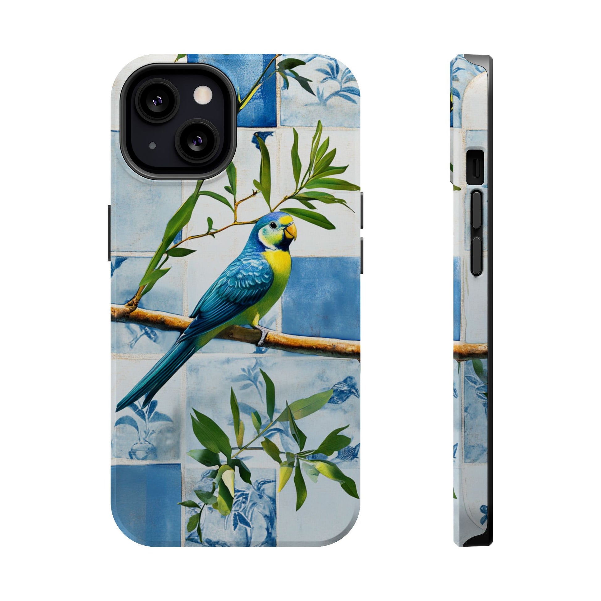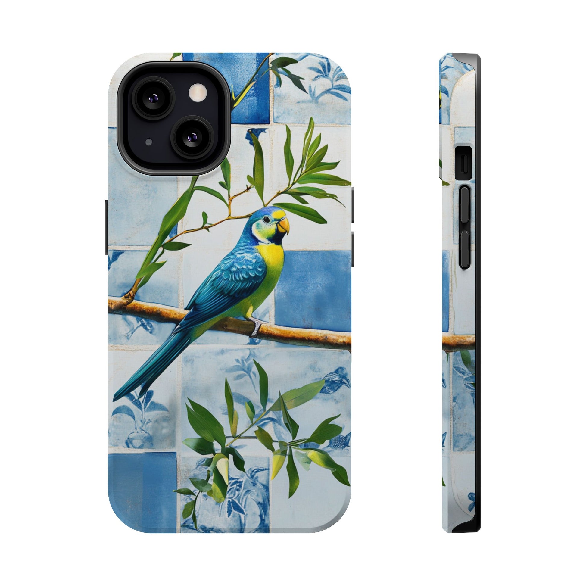 Transform your iPhone into a canvas of Portuguese artistry with this captivating MagSafe tough case. Inspired by the intricate beauty of azulejo tiles, this design features a stunning parrot – a vibrant symbol of Brazil's rich biodiversity – perched amidst a symphony of blue and white patterns.